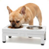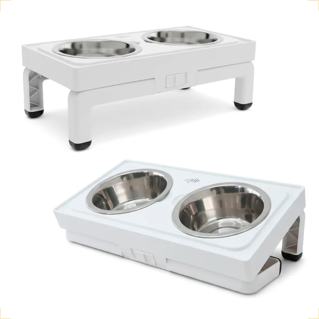 O sistema permite ajustar a altura conforme o porte do pet. Além disso, ele pode ficar inclinado ao regular um lado mais alto que o outro, facilitando o acesso ao alimento e à água, especialmente para pets idosos ou com dificuldades de mobilidade.